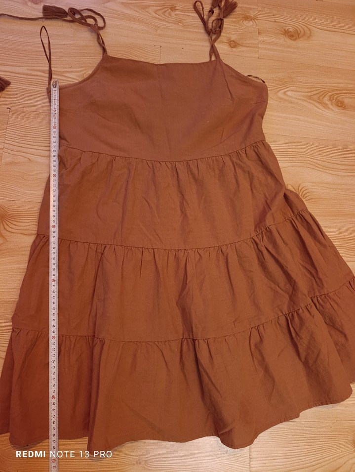 Keten kumaştan, kahverengi, volan detaylı, askılı, halter yakalı midi elbise. Salaş kesimiyle bohem tarzını yansıtır. Günlük kullanıma uygundur. askılar dan boyu ayarlanabilir DeFacto
