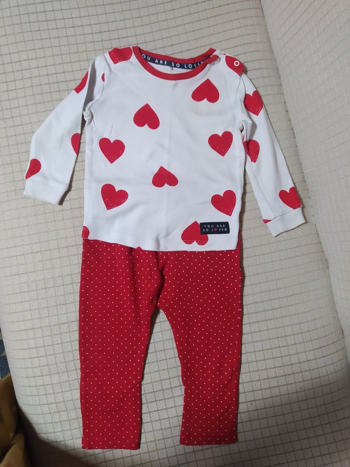 Uzun kollu, düğmeli üstü kırmızı kalp desenli, altı küçük beyaz puantiyeli kırmızı pantolonlu kız bebek takımı ❤️
