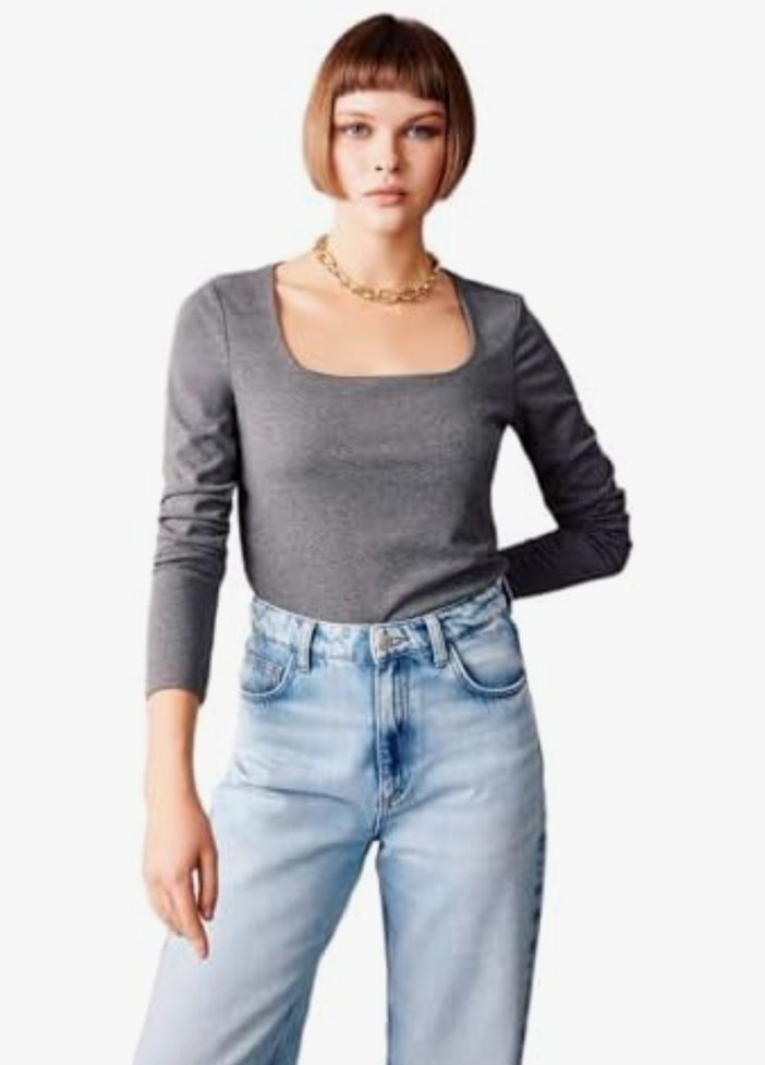 Defacto Kare Yaka Gri Bluz