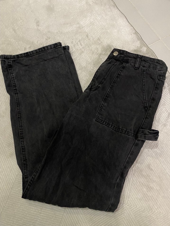 Siyah kot pantolon, bol kesim ve midi boyda, tokalı detaylı. Günlük kullanım için uygun, grunge punk tarzında rahat bir parça.