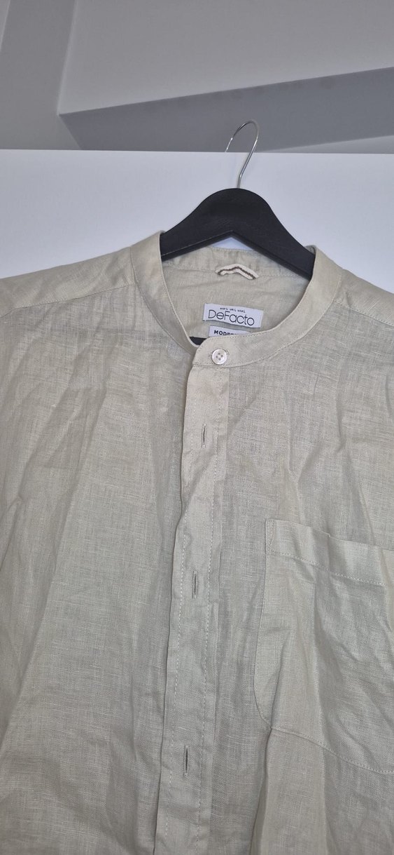 DeFacto keten kumaştan, kısa kollu ve yuvarlak yakalı, düğmeli, bol kesim, sade bej renkte erkek gömleği. Günlük kullanıma uygundur.