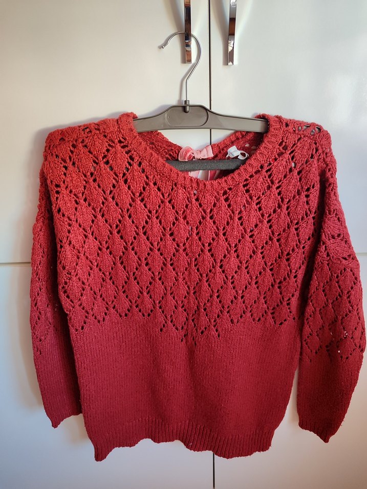 Yuvarlak yakalı ve uzun kollu kadın kazak. Rahat kesimli ve normal boyda, örgü dokusuyla bohem tarzda günlük kullanım için. rengi koyu kiremit rengi gibi