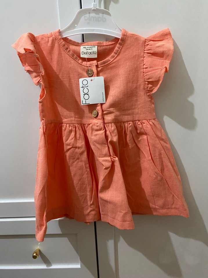 Turuncu pastel renkte, kısa kollu ve düğmeli ön kısmı olan pamuklu, bol kesim kız elbisesi. Bohem tarzda, yuvarlak yaka detaylıdır. Kullanılmadı etiketli