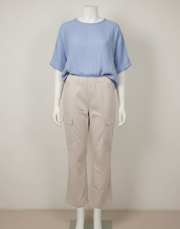 Bej keten kumaştan, rahat kesim ve midi boyda kadın pantolon. Günlük kullanıma uygun, normcore tarzıyla şık ve rahat bir görünüm sağlar. 13-14 yaş için uyumludur defosu yoktur, 6 cebi vardır