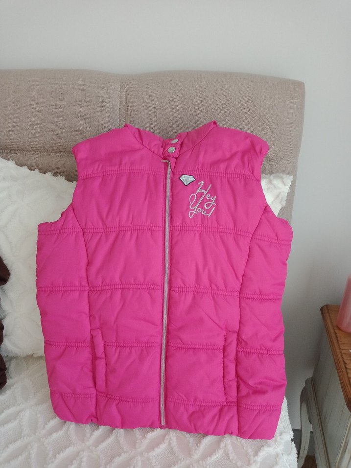 DeFacto markalı, fermuarlı ve kesimli yakalı, parlak pembe baskılı kız çocuk şişme yelek. Yumuşak ve sıcak kumaştan, sokak stili için uygun.