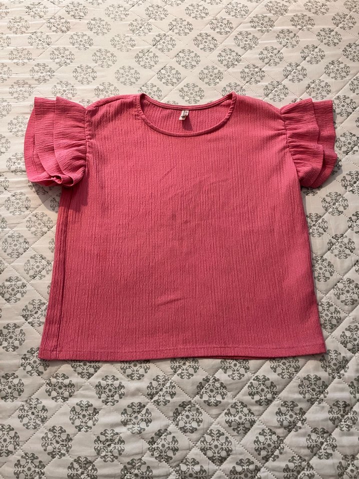 Kız çocuk keten kumaştan, kısa kollu, fırfırlı ve yuvarlak yaka tişört. Gevşek kesimi ve pastel pembe rengiyle sade bohem tarzda.