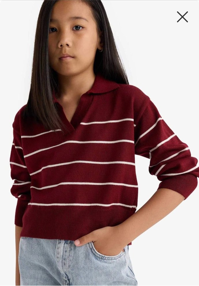 Bordo renkli, beyaz çizgili uzun kollu, polo yaka triko kazak. Rahat kesim ve normal boyda, yumuşak dokulu kumaştan üretilmiştir. sıfır etiketli ürün