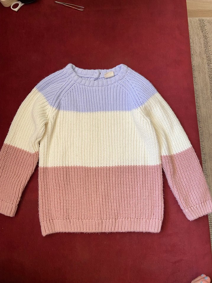Kız çocuk için yumuşak triko kumaştan, bol kesim ve bisiklet yaka, uzun kollu, pastel renk bloklarından oluşan sade kazak. Sorunsuz birkaç kez giyildi
