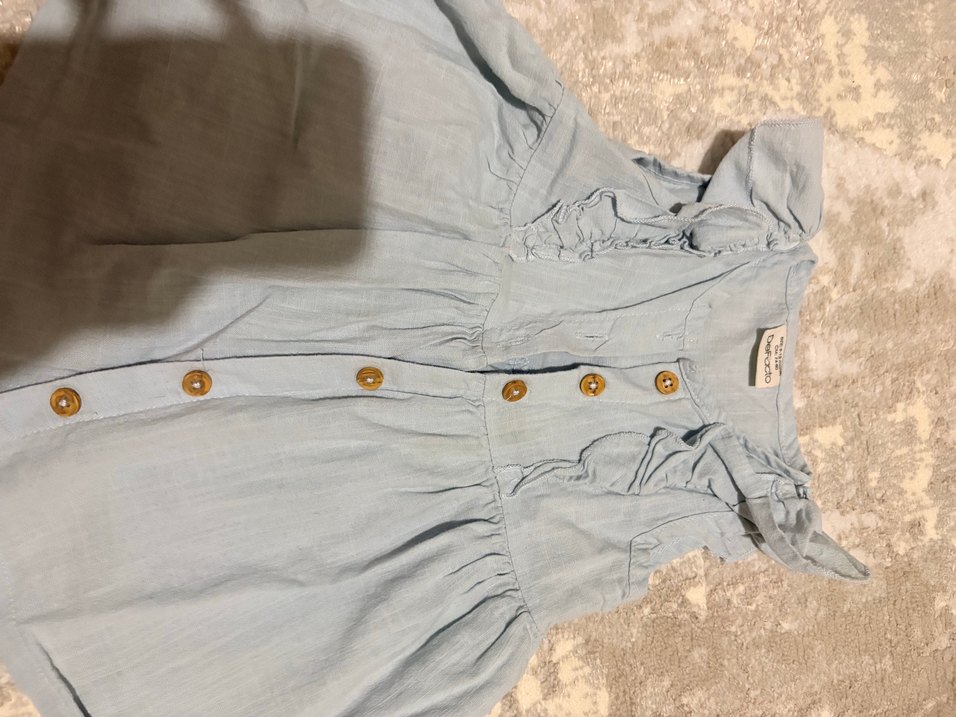 Gri keten kumaştan, kısa kollu, düğmeli ve baskılı desenli, notluk yakalı, bol kesim kız bluzu. Marka: DeFacto.