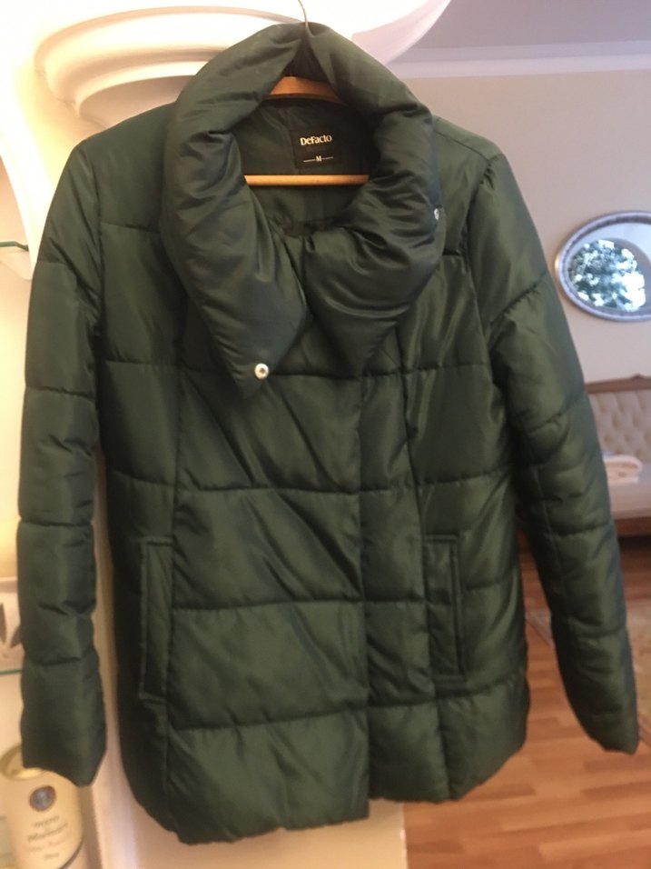Düğmeli, yüksek yakalı ve uzun kollu, koyu yeşil, normal boy midi uzunluğunda, yumuşak ve sıcak kumaştan yapılmış, rahat ve şık kışlık kadın montu. ❄️