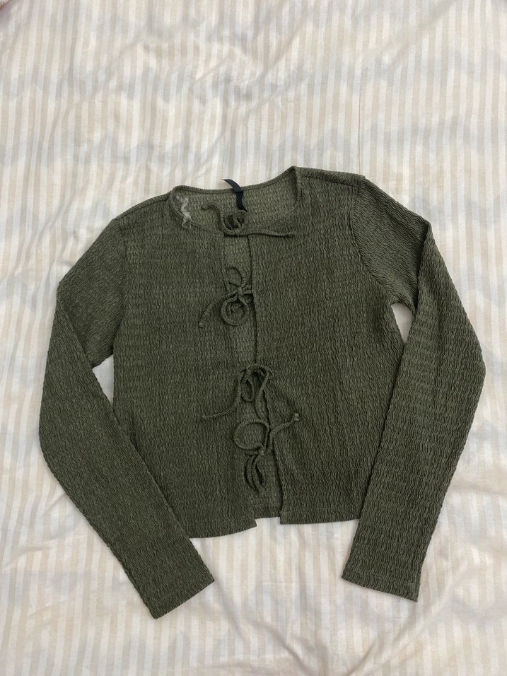 Fitted kesim, yuvarlak yaka ve uzun kollu kadın kazak. Yumuşak örme kumaştan yeşil tonunda, ön kısmında bohem tarzda örme bağcık detayları bulunur. Günlük kullanıma uygundur. Cok guzel kusursuz etıketı kopardım ancak giymedim 450₺ ye almıstım
