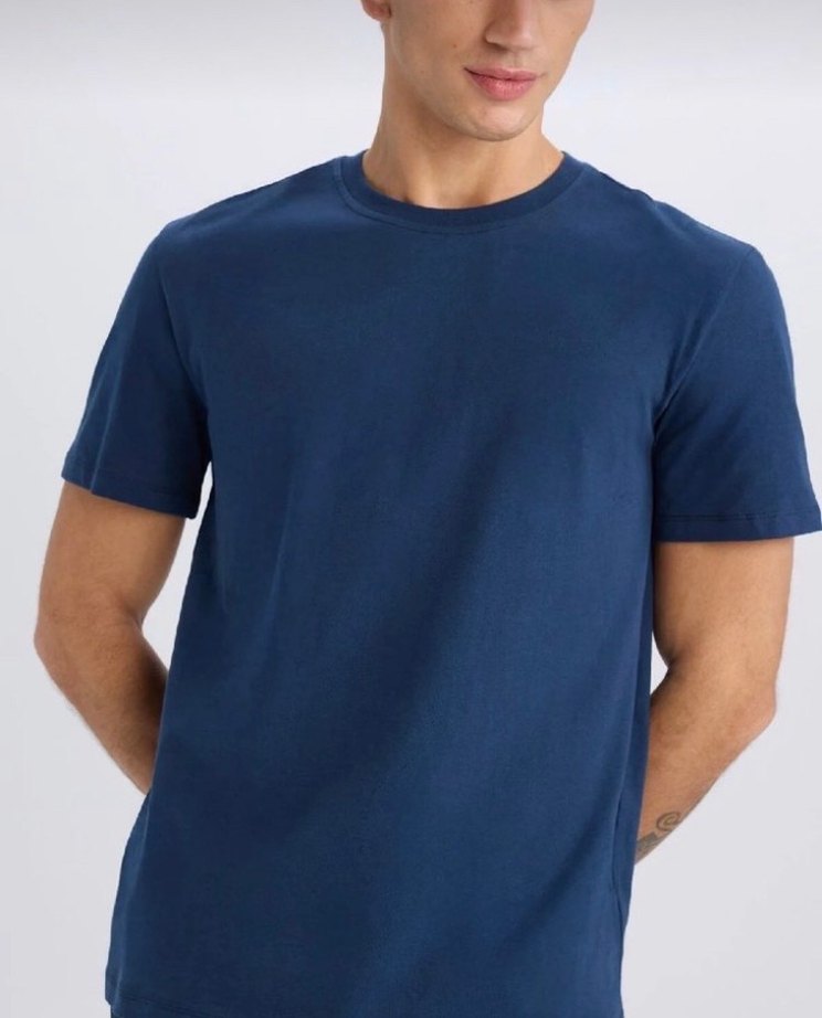 Lacivert renkli, kısa kollu, yuvarlak yakalı, denim kumaştan yapılmış, günlük kullanıma uygun, rahat kesim erkek tişörtü.