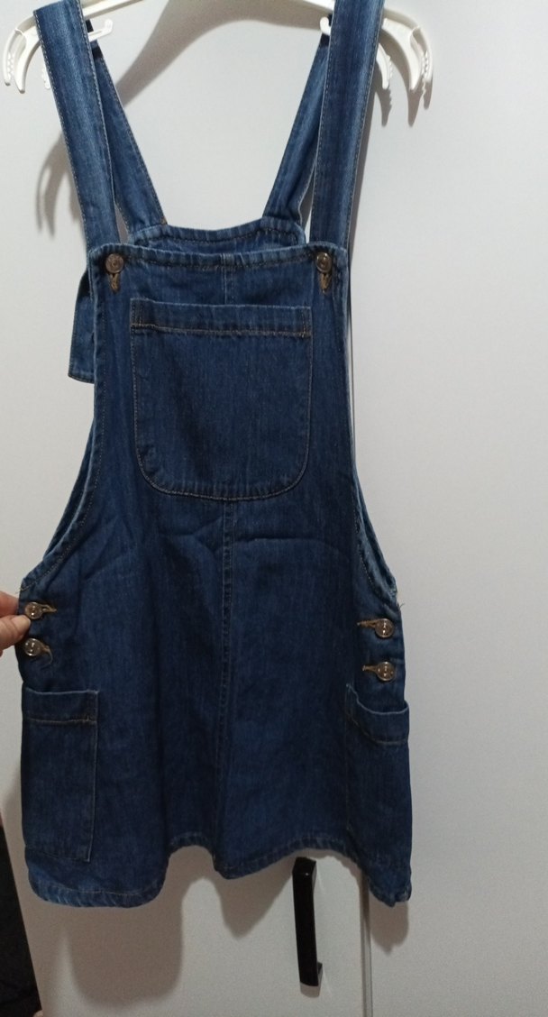 Lacivert kot kumaştan, askılı ve bol kesim midi boy salopet