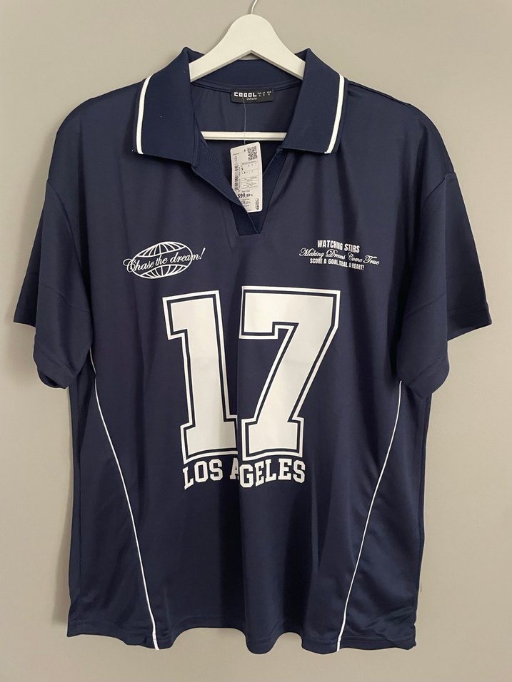Lacivert, kısa kollu, düğmeli spor tişört. Bol kesim ve polo yaka detaylı, üzerinde "17 LOS ANGELES" baskısı bulunur.
