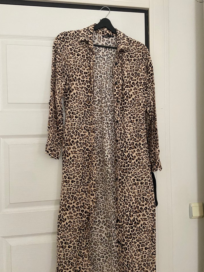 Bu uzun kadın elbisesi, bol kesim ve uzun kollu olup koyu kahverengi leopar desenine sahiptir. Paris sokak modasını yansıtır. Hiç giyilmedi ince bir kemeri vardı ama kaybettim baseni olanda maalesef olmaz bende iade etmedim basenim olduğu için hiç kullanılmadı sadece yıkandı