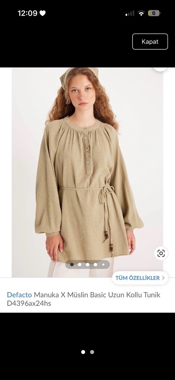 Yumuşak keten kumaştan, bej renkli, bol kesim, uzun kollu, yuvarlak yaka ve düğmeli midi boy tunik. Belde bağlama detayı bulunur, günlük kullanım için uygundur. 2-3 kere kullandım kusuru yoktur ihtiyaç fazlalığından satıyorum