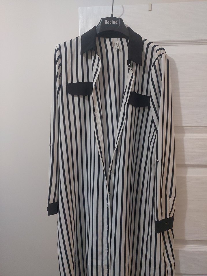 Defacto marka. Uzun kesim, düğmeli ön ve kesik yaka detaylı kadın gömleği. Uzun kollu, regular fit, siyah beyaz çizgili ve sentetik kumaştan, ofis kullanımı için uygun. 38 beden. Çok az kullanılmıştır.