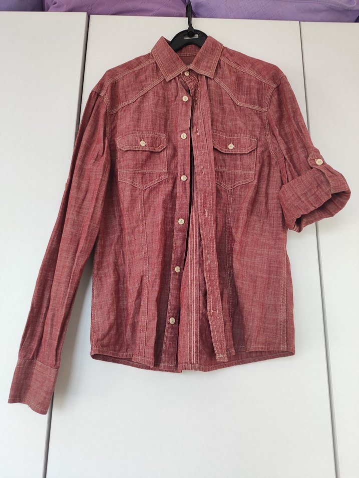 DeFacto marka Bordo renk,keten kumaştan yapılmış, düğmeli cep detaylı, notched lapel yaka ve uzun kollu, bol kesim rahat bir gömlektir.