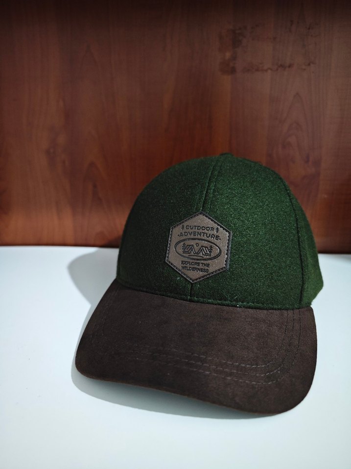 Erkek koyu kahverengi polar kumaştan, süet görünümlü siperli, cırt cırtlı kapaklı şapka. Üzerinde 'Outdoor Adventure' yazılı bir rozeti bulunur.