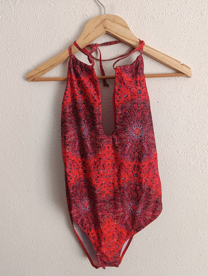 Kırmızı renkli, bohem tarzda, drapeli detaylara sahip, kısa mini kesim ve fitted tasarımlı kolsuz mayo. Dış mekan kullanımı için uygundur.