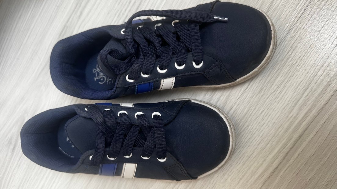Mavi renkli, elastik bağcıklı, parlak çizgili desenli ve kauçuk tabanlı erkek çocuk spor ayakkabısı. Bir kaç kere giyildi hiç bir deformesi yoktur