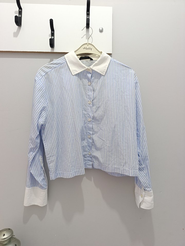 Mavi çizgili pamuklu gömlek, yakalı ve düğmeli uzun kollu. Normal boy ve regular fit, ofis ve günlük hayatiçin uygun pastel tonlarda.