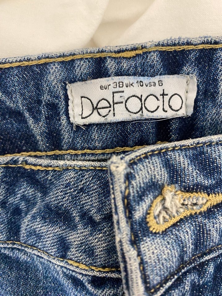 DeFacto marka, bol kesim, düğmeli, parlak mavi baskılı denim kumaştan kadın kot pantolon. Sokak stiline uygun.