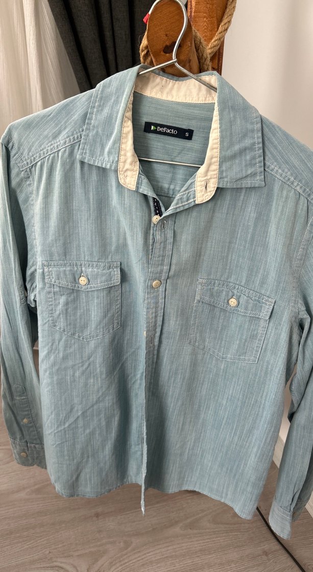 Defacto markalı mavi denim erkek gömlek, yakalı ve uzun kolludur. Düğmeli ön ve cep detaylarıyla, rahat kesim ve günlük kullanıma uygundur. Sayılı kullanıld