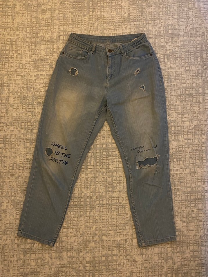 Açık mavi renkli, salaş kesim kot pantolon, yırtık detaylıdır. Günlük kullanıma uygun, rahat sokak stili jean pantolon.
