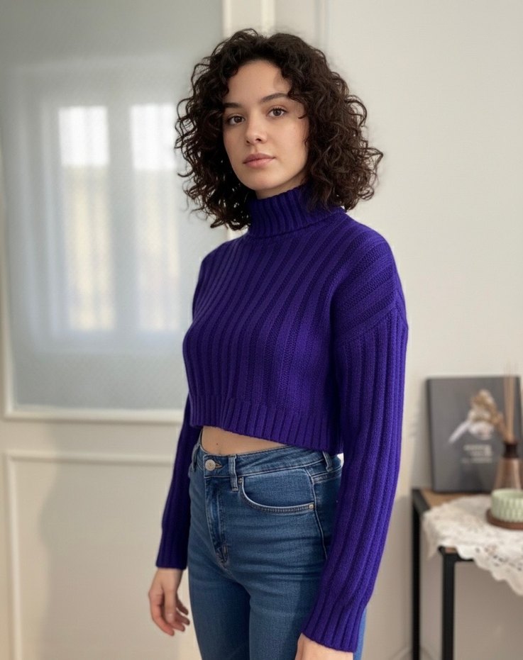 Mor boğazlı triko kazak, uzun kollu ve bol kesimdir. Normal midi boyda, desen içermeyen rahat bir tasarıma sahiptir. DeFactoS beden uygundur sayılı giyilmiştir