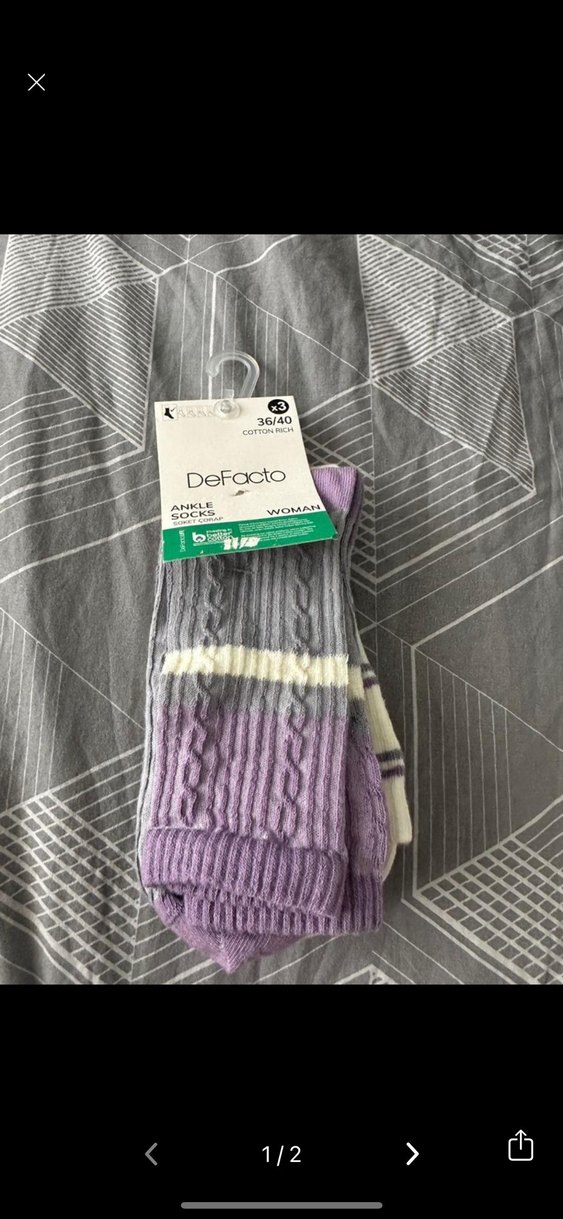 DeFacto çorabı, yumuşak yün kumaştan, mor ve gri tonlarında tie-dye desenli, beyaz çizgilerle 36-40 numara.