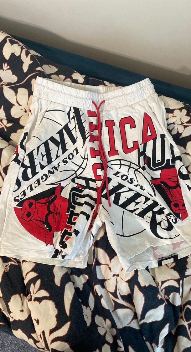 Beyaz baskılı, kırmızı dantel detaylı, gevşek kesim erkek şort. Sentetik kumaştan, rock punk sokak stiline uygun, spor için ideal.