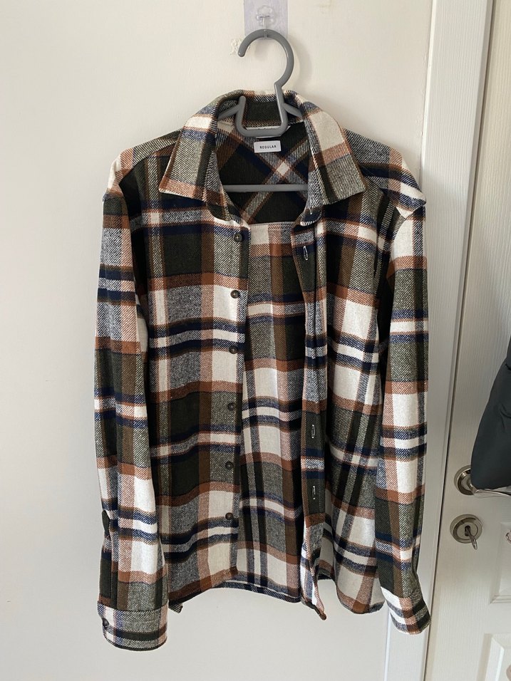 Bol kesim, düğmeli erkek gömlek, uzun kollu ve kesik yaka. Yumuşak yün kumaştan, kahverengi ekose desenli, günlük rahat kullanıma uygun. M Beden