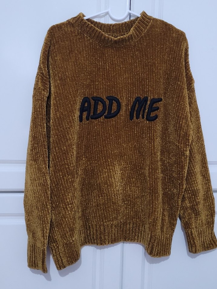 Hardal rengi örgü, yuvarlak yaka ve uzun kollu kadın kazak. Önünde 'ADD ME' nakışı bulunur. Rahat kesimiyle gündelik ve sokak stiline uygundur. Rengi ve dokusu çok çok güzel. Çok az kullanıldı. Bana büyük olduğu için satıyorum.