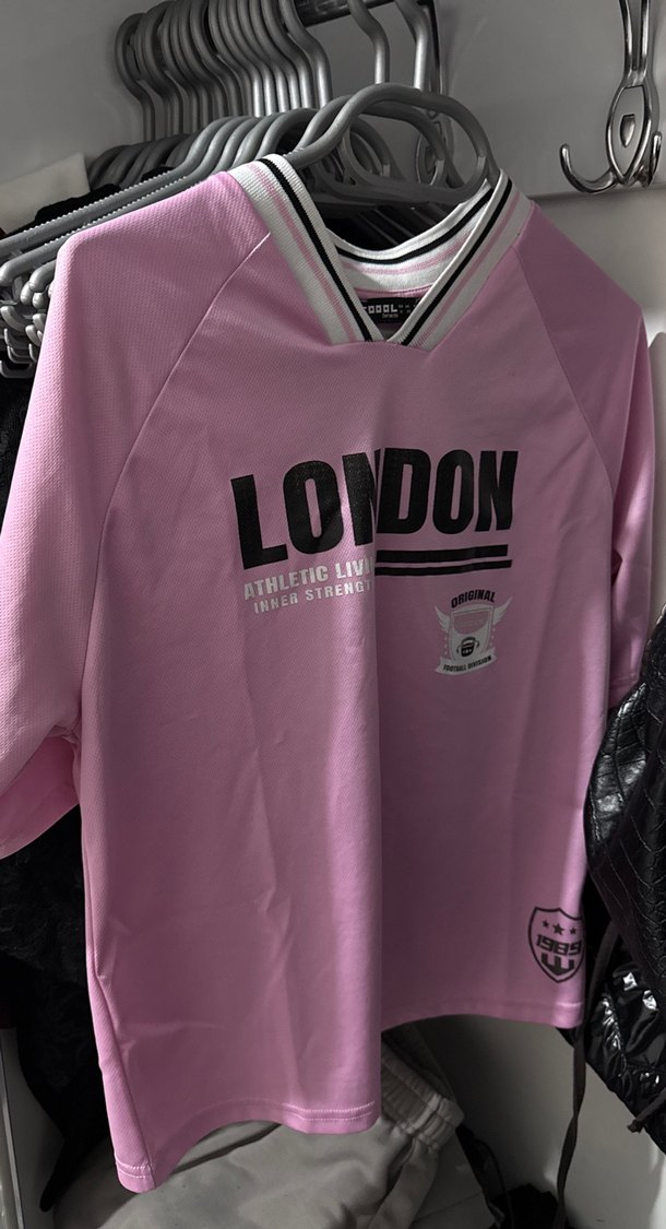 pembe oversize spor tişört, kısa kollu ve sentetik kumaştan. Yakasında dantel detay ve baskılı "LONDON" ve "ATHLETIC LIV" yazıları bulunur