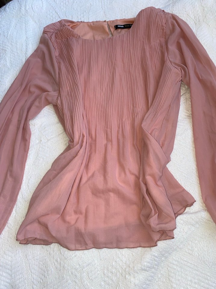 L beden Pembe renkli, pilili detaylara ve yuvarlak yaka sahip, ipeksi kumaştan üretilmiş, bol kesim uzun kollu kadın bluz.