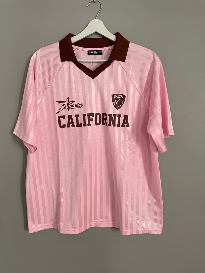 Pamuk hissi veren sentetik kumaştan, düğmeli yaka ve baskılı "CALIFORNIA" yazılı pembe, gevşek kesim erkek spor tişörtü.
