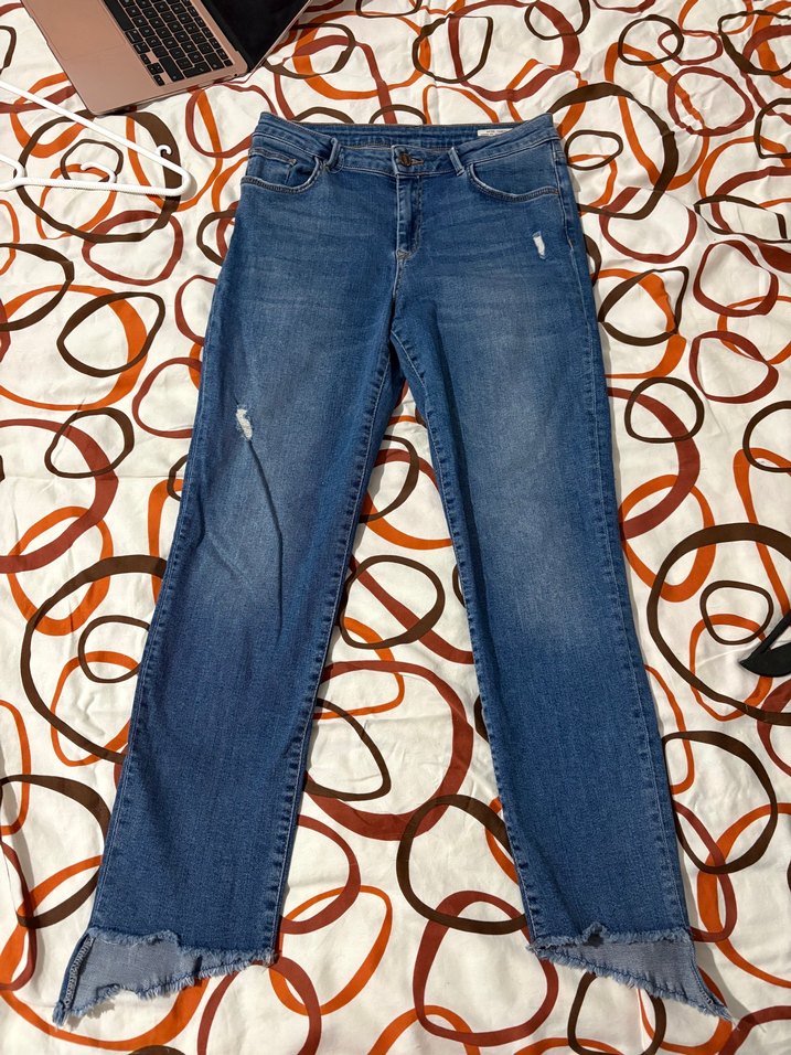 Mavi regular fit midi boy kot pantolon, yırtmaç detaylı ve paçası asimetrik, günlük rahat kullanıma uygun. Birkaç kez giyildi, çok rahat bir pantolon.