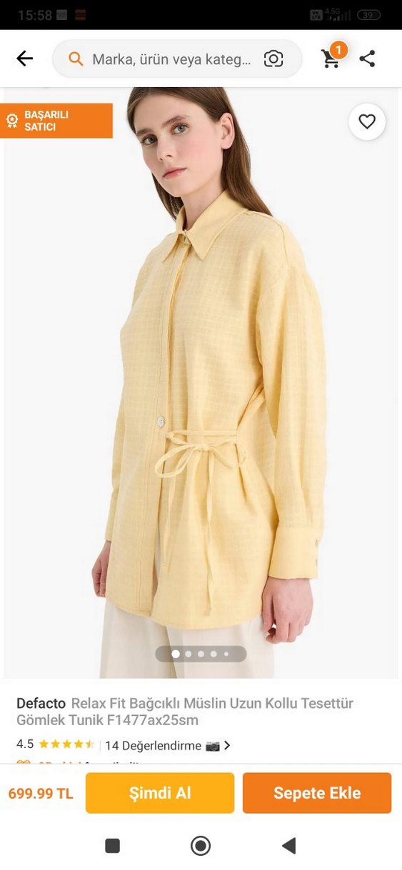 Defacto marka, bağcıklı ve uzun kollu, rahat kesim sarı gömlek. Yumuşak keten kumaştan, günlük kullanıma uygun.