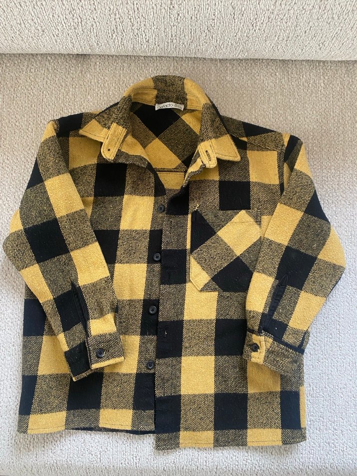 6-7 yaş erkek çocuk. Sarı siyah ekose desenli, yün kumaşlı uzun kollu, notalı yaka ve düğmeli önü olan bol kesim kadın gömlek. Rahat ve günlük kullanım için uygundur.