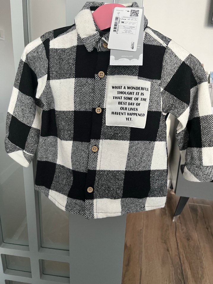 Pamuk kumaştan, gri beyaz ekoseli, düğmeli, uzun kollu pantolonlu ikili takım beden 6-9 ay sıfır hiç kullanılmadı