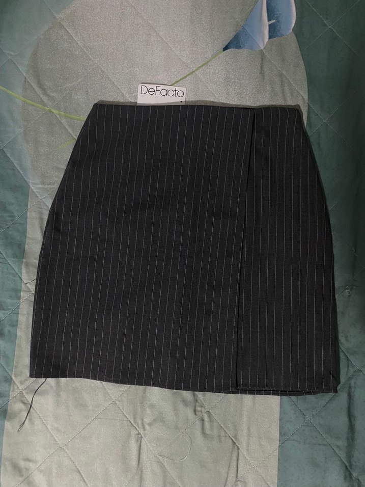 DeFacto marka, siyah ve gri çizgili pilili midi etek. Sentetik kumaştan, normal kesim ve iş ortamına uygun şık bir görünüm sunar.