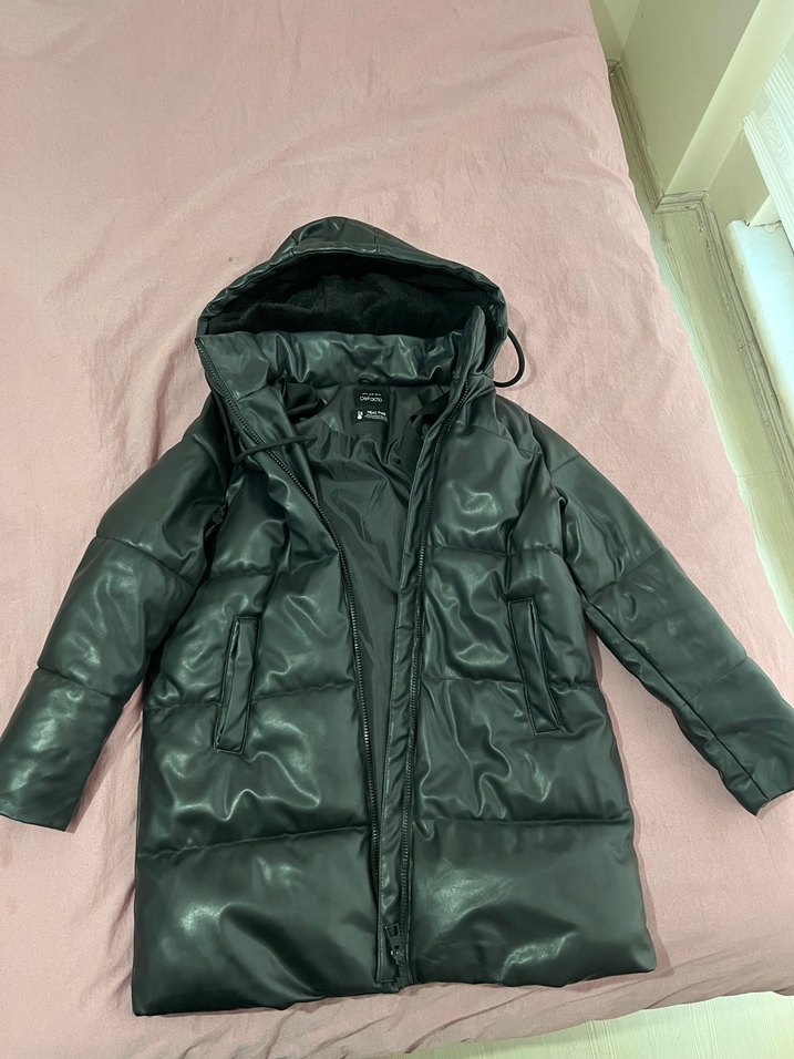 Siyah deri kapüşonlu kadın kışlık mont, fermuarlı. Dar kesim ve uzun kollu, sokak stili ve günlük kullanım için uygundur. Kolunda ufak bir defosu var
