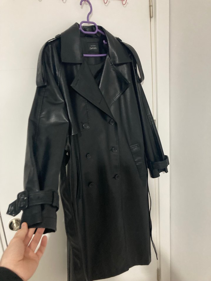 ÜRÜN HİÇ KULLANILMADI! Beden ölçüleri: 115 cm boyu, 60 cm koltuk altı mesafesidir. Siyah deri kadın trençkot, kemerli ve yakası kesik. Askılı kolları ve bol kesimiyle gotik, şık bir tarz sunar.