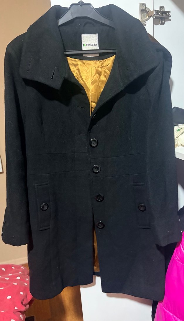 Defacto marka siyah kaban, düğmeli kapama ve sıcak tutan iç astara sahiptir. Klasik yakalı ve düğmeli iki ön ceplidir.