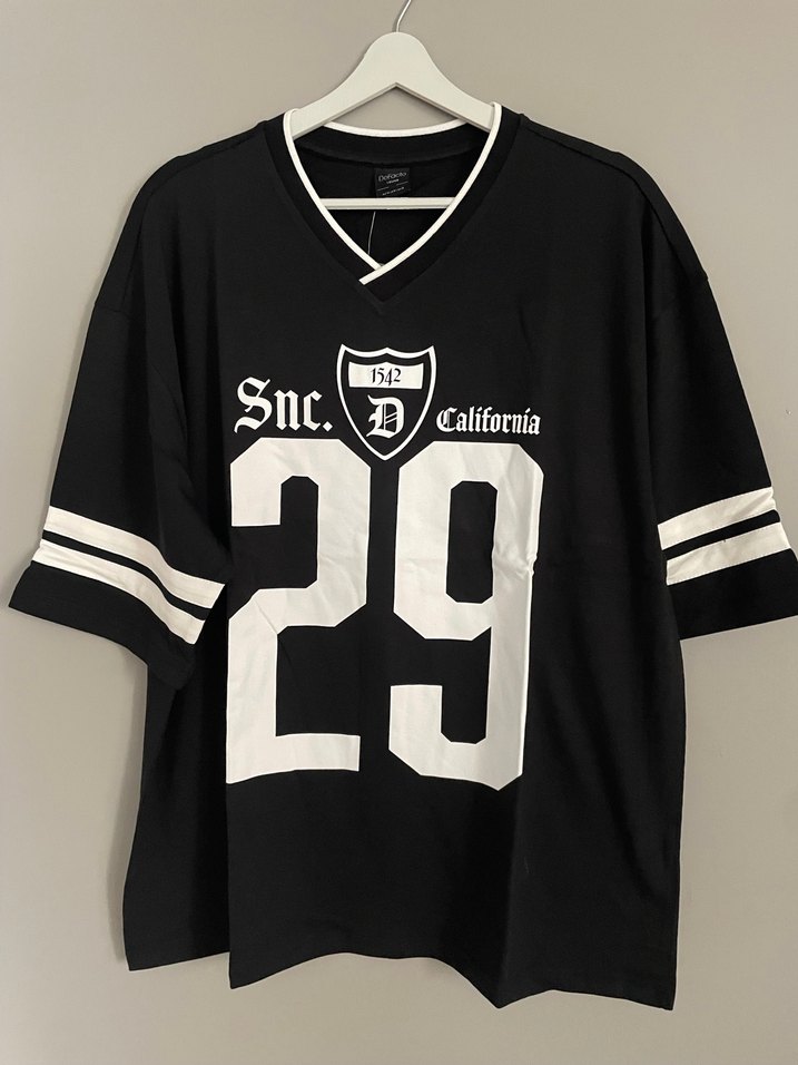 Pamuk kumaştan, kısa kollu, yuvarlak yakalı, bol kesim siyah erkek tişört. Önünde büyük '29' baskısı ve dantel detayları bulunur. Spor ve streetwear tarzını yansıtır.