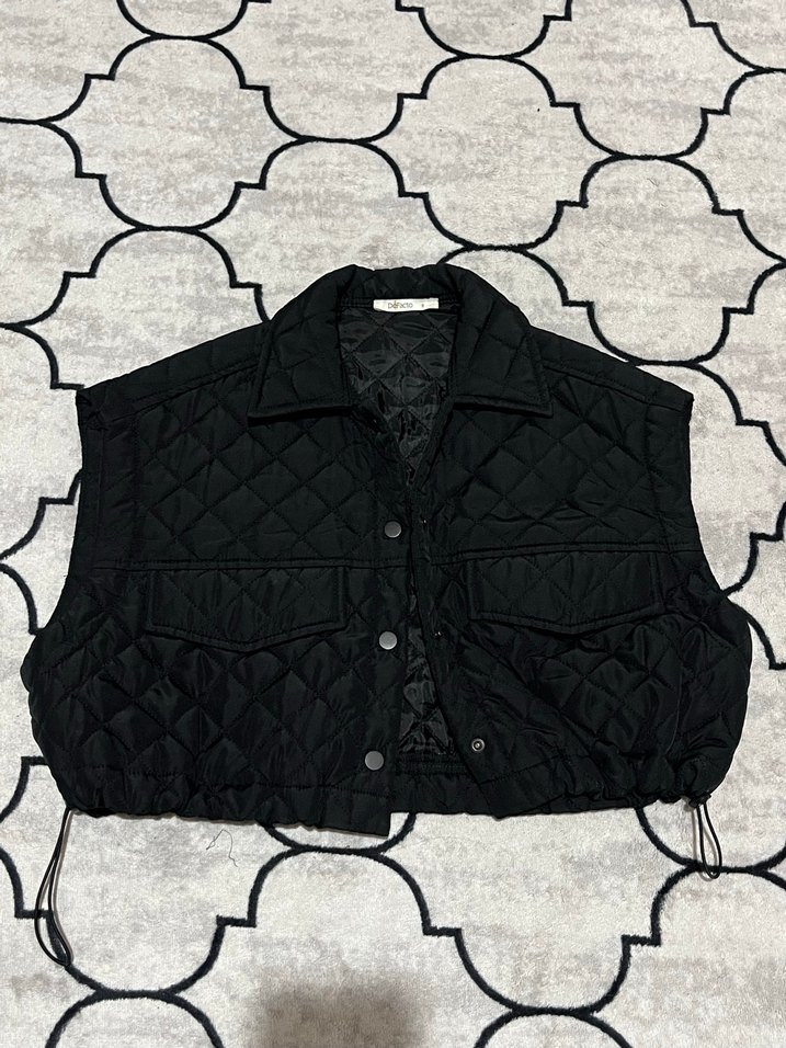 Düğmeli, askısız yakalı, siyah, kapitone desenli, sentetik kumaştan, salaş kesim kadın yelek. Rahat ve günlük kullanıma uygun.