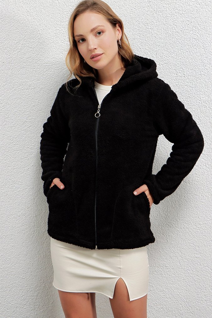 Siyah kapüşonlu, uzun kollu ve kürklü detaylı yumuşak kumaştan rahat kesim kadın ceket. Günlük sokak stili için uygundur.