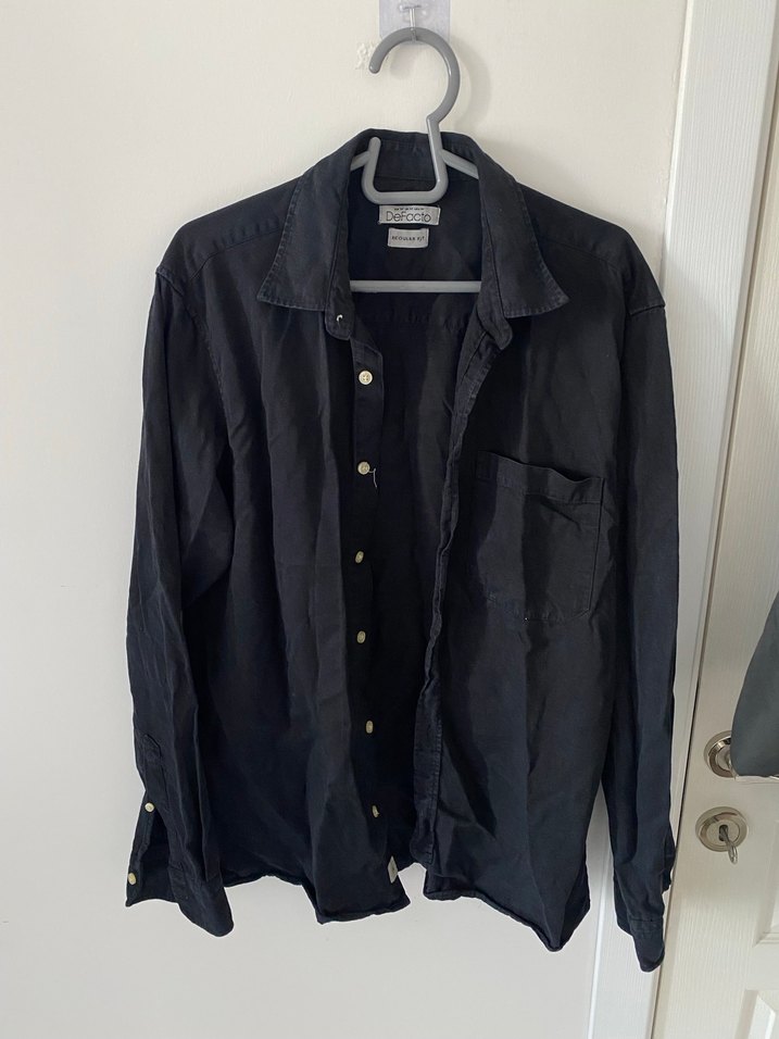 Siyah keten kumaştan, düğmeli, uzun kollu, normal boyda, bol kesim erkek gömlek. Günlük kullanıma uygundur. M Beden