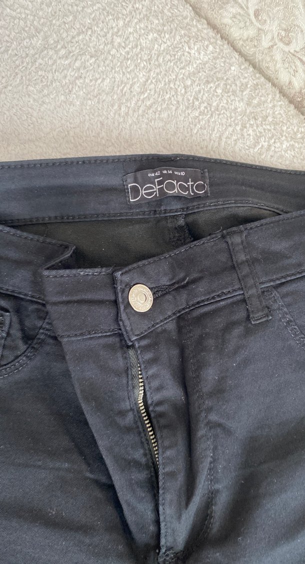 DeFacto marka, düğmeli ve nakış detaylı siyah kot pantolon. Günlük kullanıma uygun, normal boyda ve vücuda oturan kesime sahip.